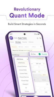 Instead of manually picking each contract, you now define logics for each leg. This Option Trading platform instantly identifies the best strikes that match your logic. There are a total of 9 conditions of Quant Mode (like ATM Points, Closest Premium, Delta, Gamma, etc.) based on which you can create the logics for Sensex option trading or Nifty option trading.