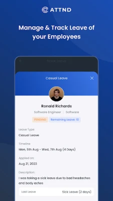 ✅ Leave & Holiday Integration More than just a tracker, Attnd serves as a leave and holiday tracker. Employees can request time off directly through the leave management app, keeping your attendance register updated automatically.