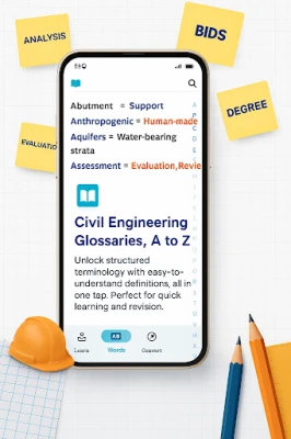 Meanings: Access a comprehensive glossary of civil engineering terms. Instead of relying on external sources, find definitions and explanations directly within the app. Expand your technical vocabulary effortlessly.